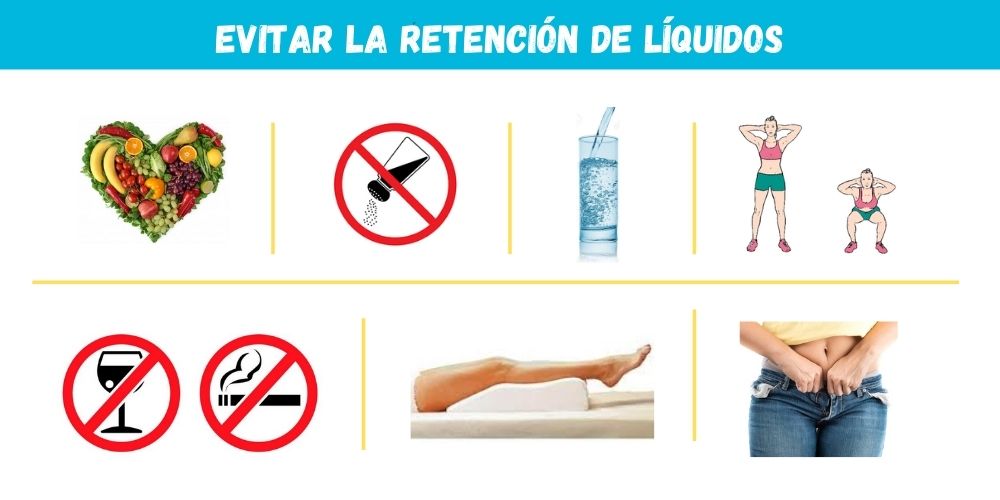 Una vez que hemos descartado que nuestra retención de líquidos NO es producida por una patología, tras haber consultado a un especialista, podemos optar por cumplir las siguientes pautas para evitarla: